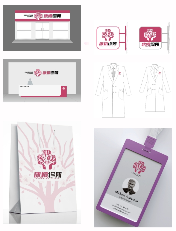 康樱诊所品牌标志采用以樱花为基调的色彩,旨在确保各类宣传物料、门店装饰等方面的视觉风格保持统一,让患者能感受到温暖和舒适的就医环境。